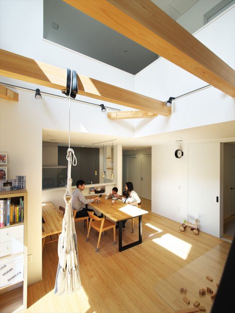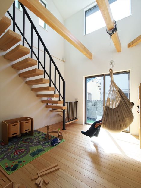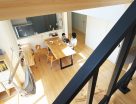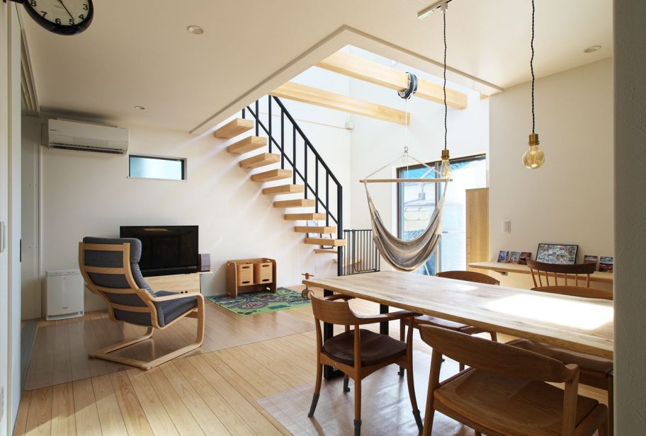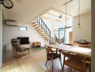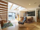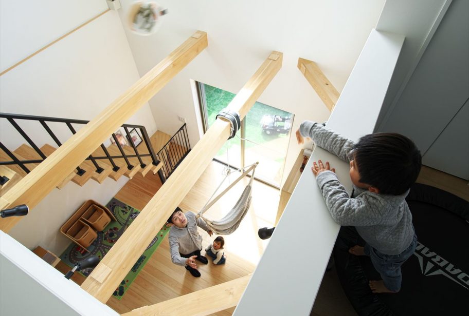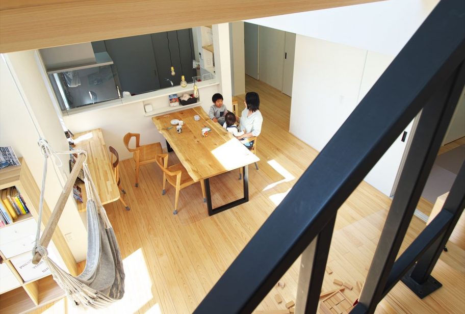 太陽の恵みを最大限に取り入れられるように、リビング南東角に大きな吹き抜けを設け、日向ぼっこができるぐらいの明るいLDK空間で出来上がりました。