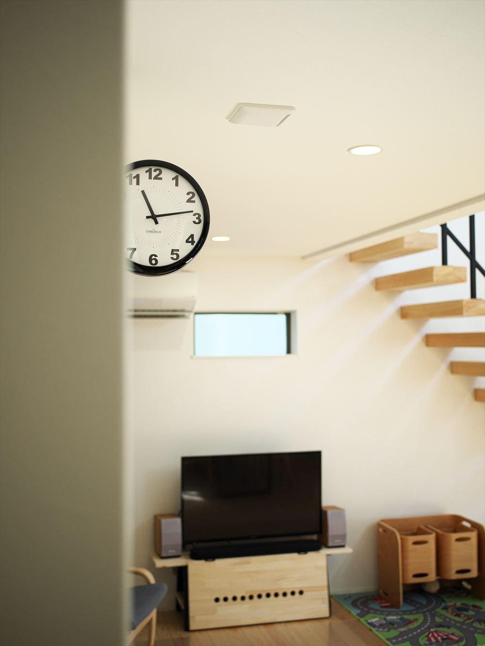リビングには一番の見せ場、バァーナホーム特製のオープン階段(匠の階段)を設け、吹き抜けと併設。