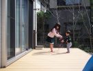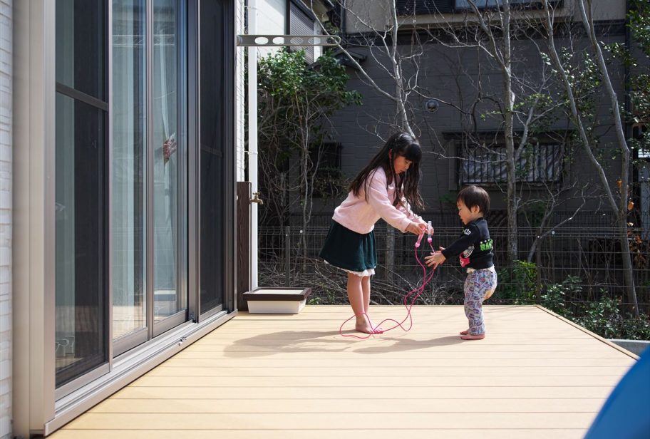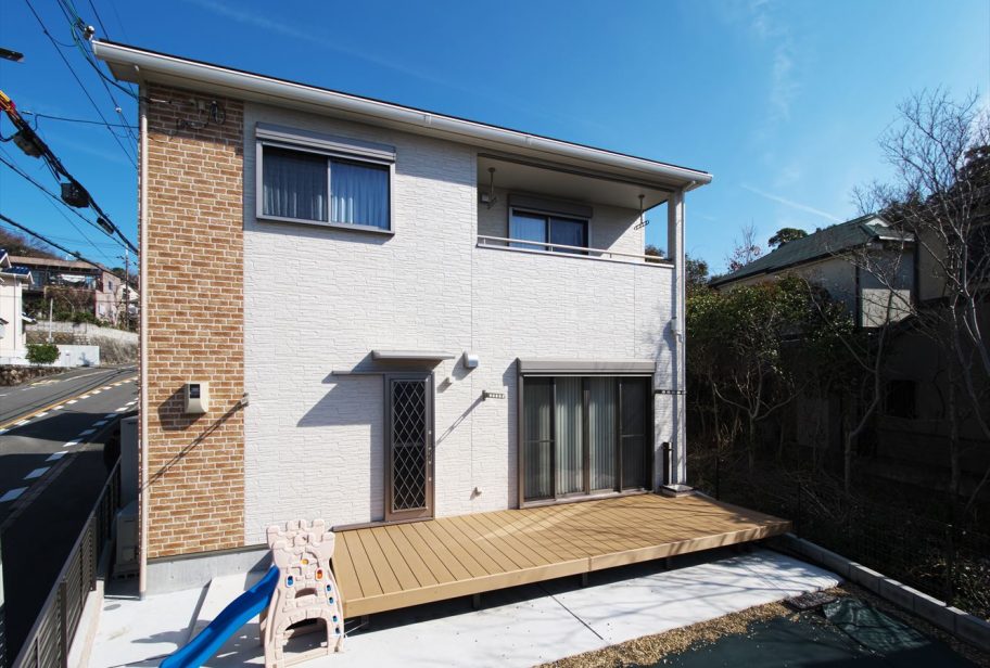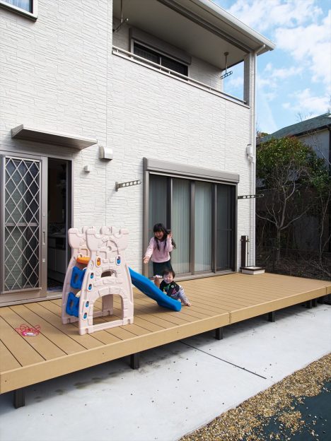 お家の中で遊び回った後は、リビング直結のウッドデッキへ出て、滑り台や日向ぼっこでもできるように♡また外でBBQする時に大活躍するウッドデッキも大きくて最適です。