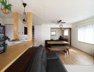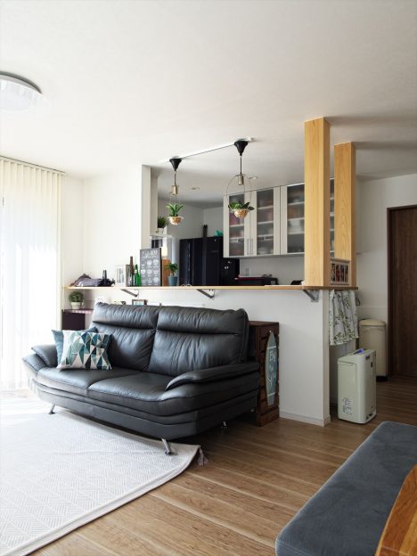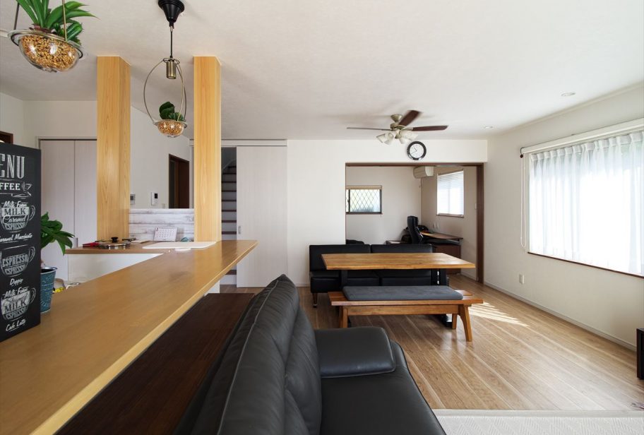 子育て世代のママの味方、キッチンスペースから全方向が見渡せるよう設計しました。キッチン横の独立、檜の柱によりナチュラルな雰囲気があり、落ち着きある空間になりました。