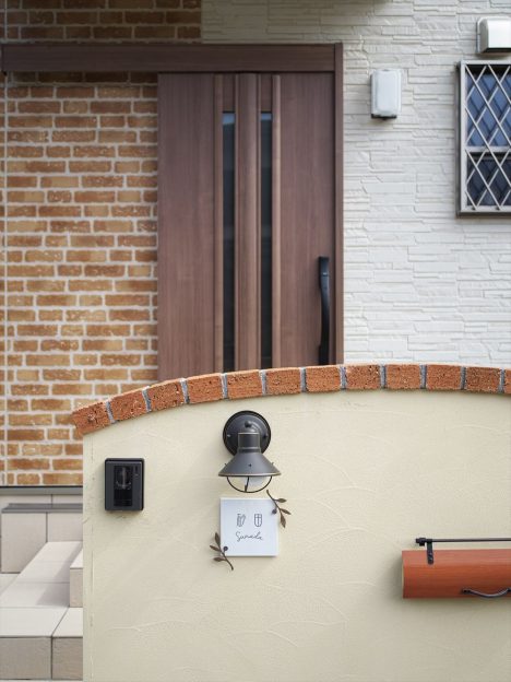 R形状でオシャレな門柱の先に、出入りの際、とても便利な玄関引き戸を設置。お家の顔が優しく柔らかいイメージに仕上がりました。