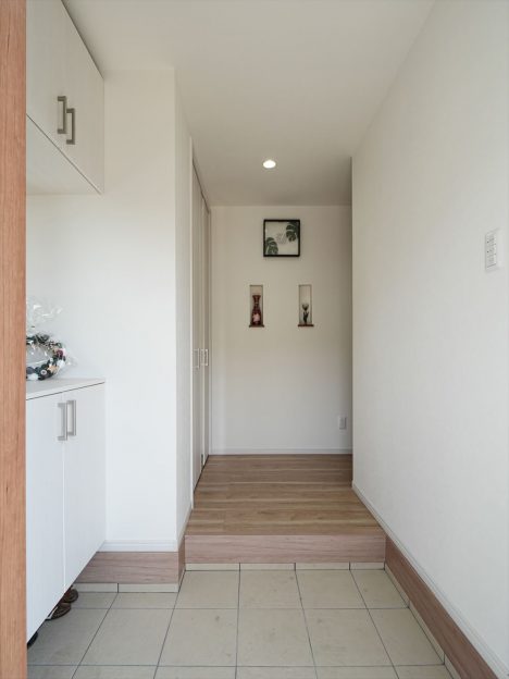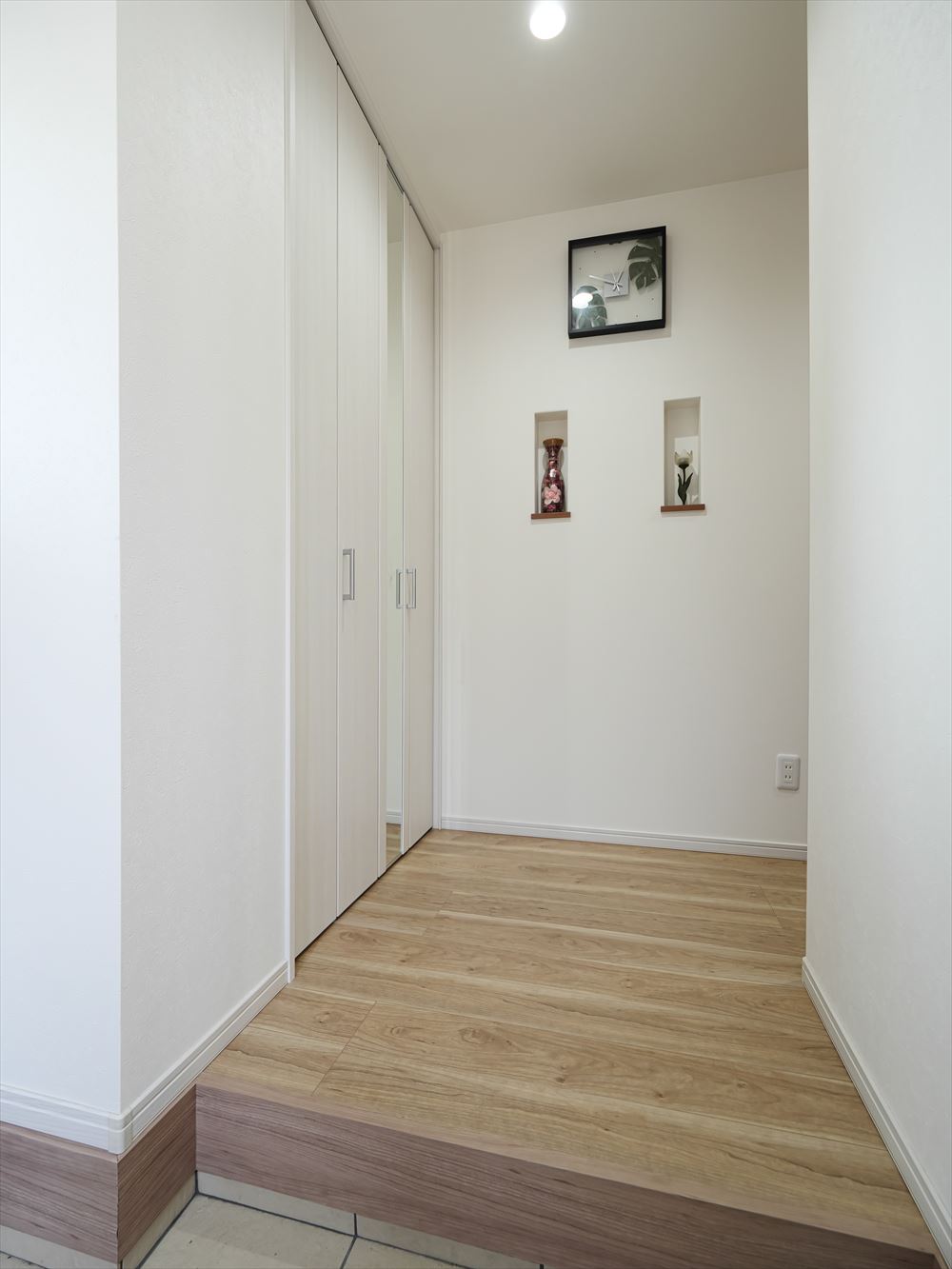 玄関引き戸を開けて中へ入ると左右対照のニッチがお出迎え。このニッチも建築途中の現場打ち合わせの際に、大工さんと一緒に決めました。