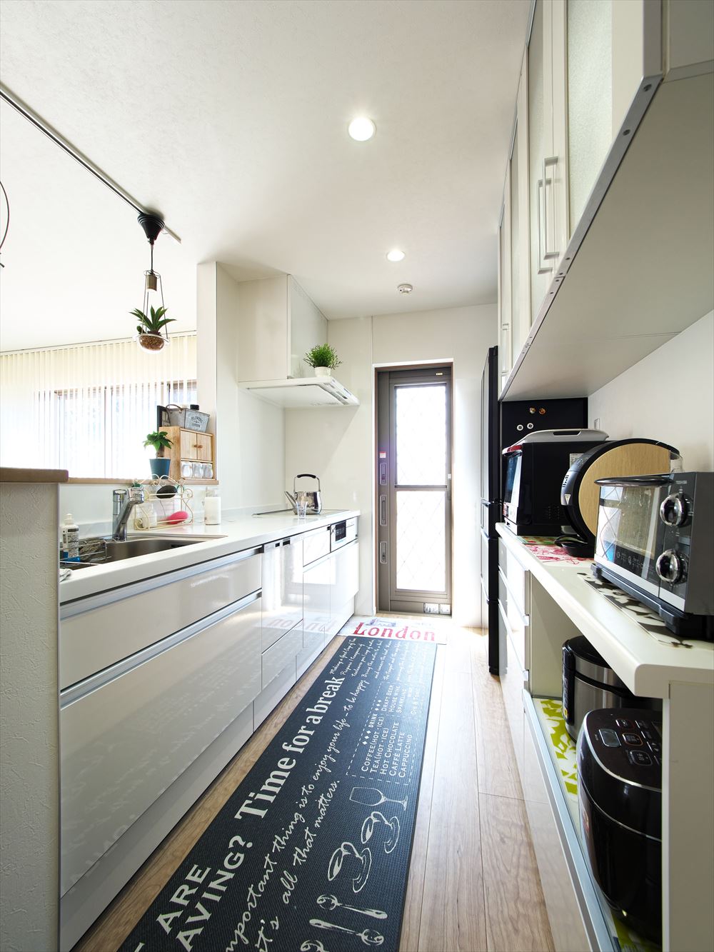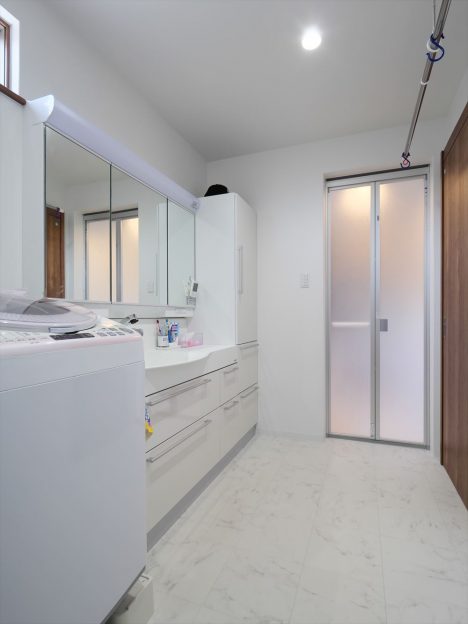 白を基調とした洗面脱衣室ならではの爽やかな空間は、ご家族の多いS様に合わせて広々設計。外干しできない時のため、室内干しも可能にしました。