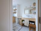 こだわりの無垢板と病院シンクを組み合わせた造作洗面化粧台。その横にはたっぷり収納。一日の中で一番使用頻度が多いと言っても過言ではない洗面室を広々、快適な空間に。