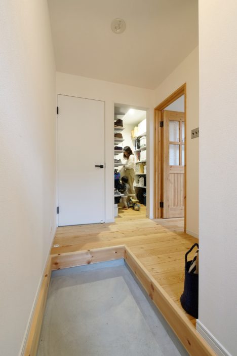 玄関ホールからもリビングからも出入りできるシューズクローク。家族みんなの靴が収納できて、お父さんの趣味、釣り道具も一緒に収納できてたっぷり収納。